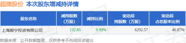 证券之星消息,11月25日超捷股份发布公告《超捷股份:超捷紧固系统(上海)股份有限公司关于控股股东权益变动触及1%整数倍的公告》,其股东上海毅宁投资有限公司于2025年11月25日合计减持132.85万股,占公司目前总股本的0.9894%,变动期间该股股价上涨5.65%,截止11月25日收盘报59.51元。