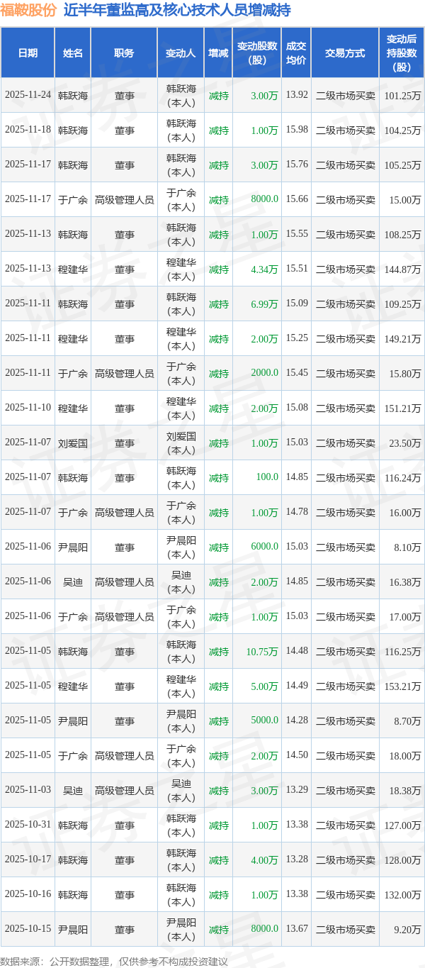 福鞍股份近半年内的董监高及核心技术人员增减持详情如下: